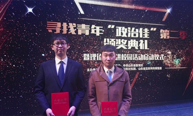 1月21日,由山东省委党校指导,共青团山东省委、山东社会科学院和山东省互联网传媒集团联合主办的大型网络励志互动节目“逐梦新时代—寻找青年‘政治佳’(第二季)”颁奖典礼在济南举行。我校陈昊鹏同学作品《念好“五字真诀”,打造当代青年践行核心价值观的主阵地》、徐达同学作品《牢记嘱托,不辱使命——做民族复兴伟业的时代新人》分别荣获十佳青年学生“政治佳”荣誉称号,学校获最佳组织奖。