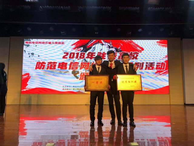 12月11日,由泰安市公安局、共青团泰安市委、山东省互联网传媒有限公司泰安分公司联合举办的“2018驻泰高校防范电信网络诈骗知识竞赛”在泰山学院举行,山东农业大学代表队获得一等奖,王晓明、车旭、柳启龙3名同学分别荣获个人一等奖,学校荣获优秀组织奖。